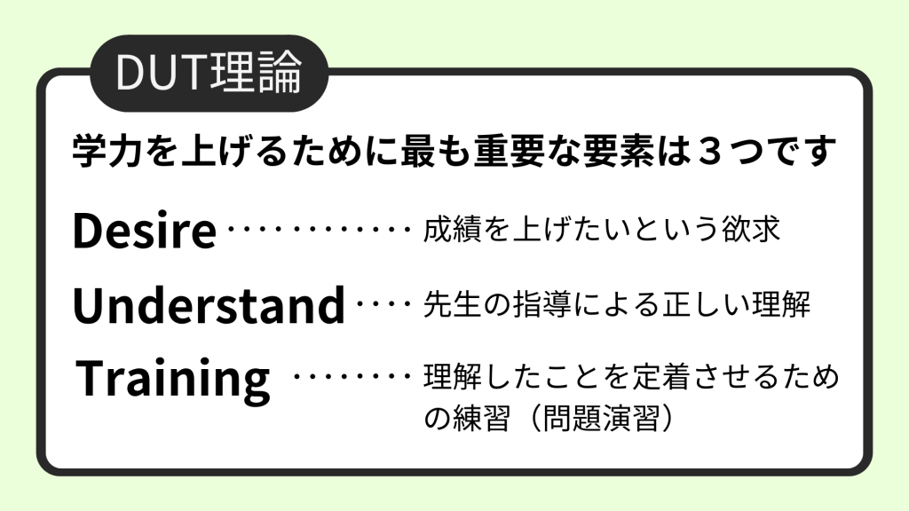 教わって理解できたことでも、練習が足りなければ、本物の実力は身に付きません。DUT理論、それは「理解(Understand)すること以上に練習(Training)が大切である」という理論でもあるのです。トレーニングの量を増やすということが学力を上げる一番の近道という、当たり前のことを、もう一度考え直してみましょう。