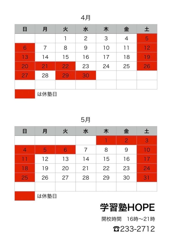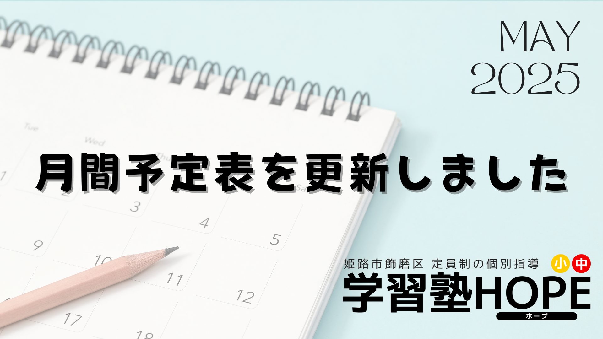 【学習塾HOPE】月間予定表を更新しました! 2025 4/17 お知らせ 2025年4月16日2025年4月17日 こんにちは。学習塾HOPEです。 5月の月間予定表を更新しました!※合わせて4月の予定もご確認ください ご不明点などございましたら、お気軽にお問い合わせください! お知らせ よかったらシェアしてね! URLをコピーしました! 【学習塾HOPE】月間予定表を更新しました 【学習塾HOPE】4月・5月は2週間無料でご体験いただけます! 関連記事 【学習塾HOPE】教室長コラム(1月) 2026年1月5日 【学習塾HOPE】月間予定表を更新しました! 2025年12月12日 【学習塾HOPE】小6対象 中学準備講座開講!! 2025年12月8日 【学習塾HOPE】教室長コラム(12月) 2025年12月3日 【学習塾HOPE】テスト直前勉強会を実施しました! 2025年11月17日 【学習塾HOPE】月間予定表を更新しました! 2025年11月13日 【学習塾HOPE】教室長コラム(11月) 2025年11月4日 【学習塾HOPE】月間予定表を更新しました! 2025年10月17日