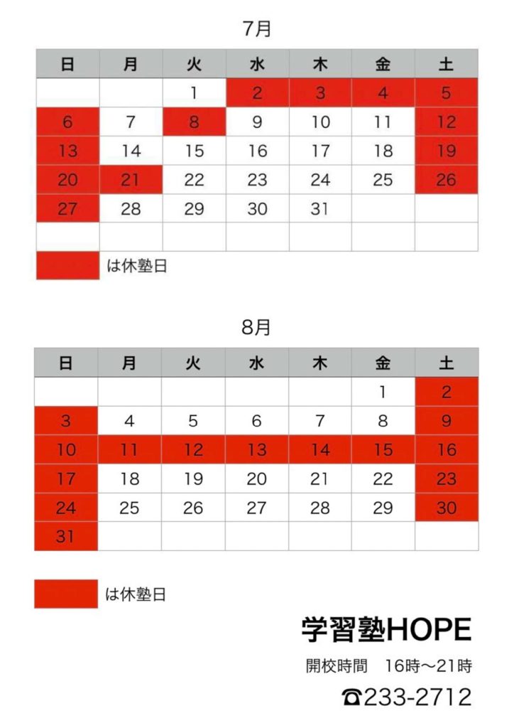 【学習塾HOPE】月間予定表を更新しました! 2025 8/12 お知らせ 2025年7月10日2025年8月12日 こんにちは。学習塾HOPEです。 8月の月間予定表を更新しました!※合わせて7月の予定もご確認ください ご不明点などございましたら、お気軽にお問い合わせください! お知らせ よかったらシェアしてね! URLをコピーしました! 【学習塾HOPE】夏期1ヶ月 無料体験受付中! 【学習塾HOPE】1学期期末テスト成績アップ速報! 関連記事 【学習塾HOPE】教室長コラム(1月) 2026年1月5日 【学習塾HOPE】月間予定表を更新しました! 2025年12月12日 【学習塾HOPE】小6対象 中学準備講座開講!! 2025年12月8日 【学習塾HOPE】教室長コラム(12月) 2025年12月3日 【学習塾HOPE】テスト直前勉強会を実施しました! 2025年11月17日 【学習塾HOPE】月間予定表を更新しました! 2025年11月13日 【学習塾HOPE】教室長コラム(11月) 2025年11月4日 【学習塾HOPE】月間予定表を更新しました! 2025年10月17日