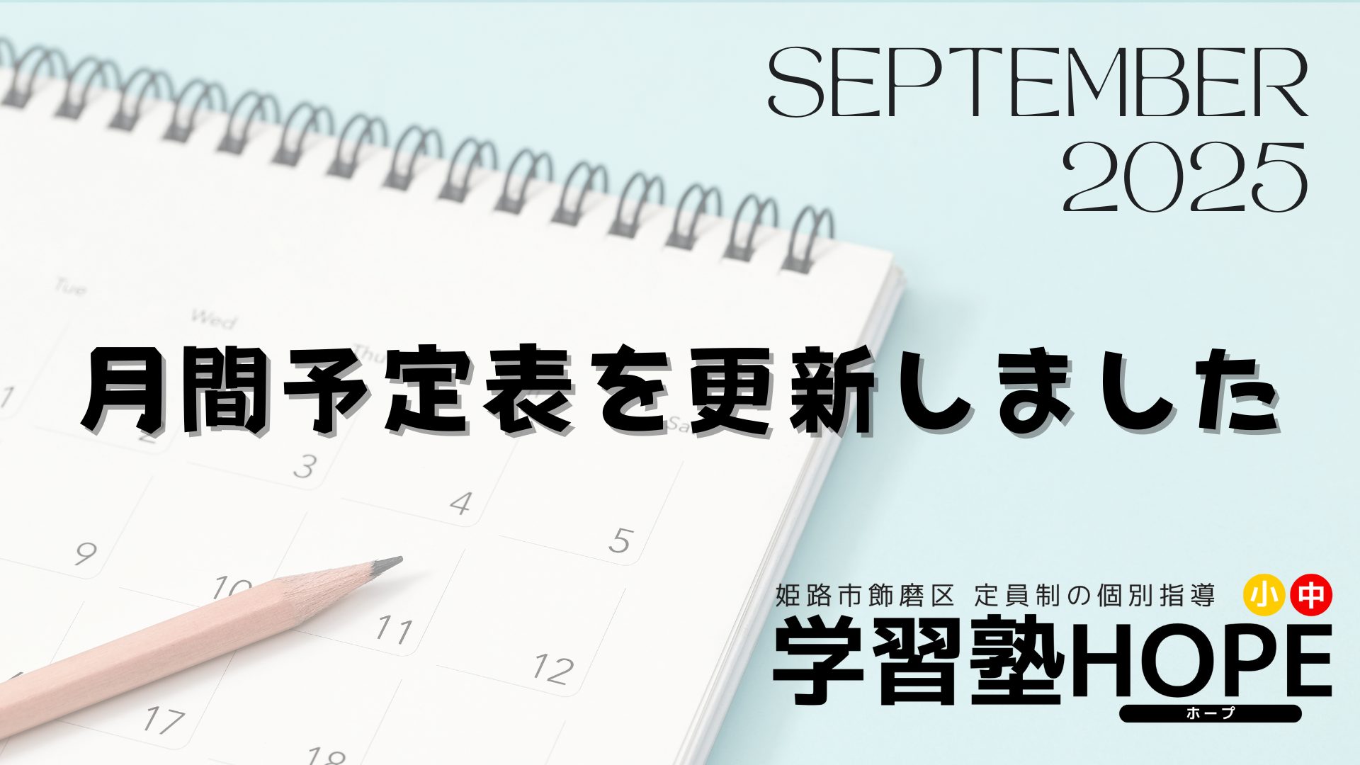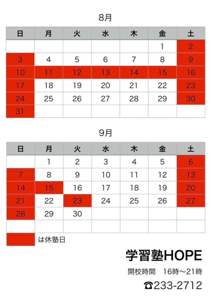 【学習塾HOPE】月間予定表を更新しました! 2025 8/12 お知らせ 2025年8月12日 こんにちは。学習塾HOPEです。 9月の月間予定表を更新しました!※合わせて8月の予定もご確認ください ご不明点などございましたら、お気軽にお問い合わせください! お知らせ よかったらシェアしてね! URLをコピーしました! 【学習塾HOPE】1学期期末テスト成績アップ速報! 【学習塾HOPE】月間予定表を更新しました! 関連記事 【学習塾HOPE】教室長コラム(1月) 2026年1月5日 【学習塾HOPE】月間予定表を更新しました! 2025年12月12日 【学習塾HOPE】小6対象 中学準備講座開講!! 2025年12月8日 【学習塾HOPE】教室長コラム(12月) 2025年12月3日 【学習塾HOPE】テスト直前勉強会を実施しました! 2025年11月17日 【学習塾HOPE】月間予定表を更新しました! 2025年11月13日 【学習塾HOPE】教室長コラム(11月) 2025年11月4日 【学習塾HOPE】月間予定表を更新しました! 2025年10月17日