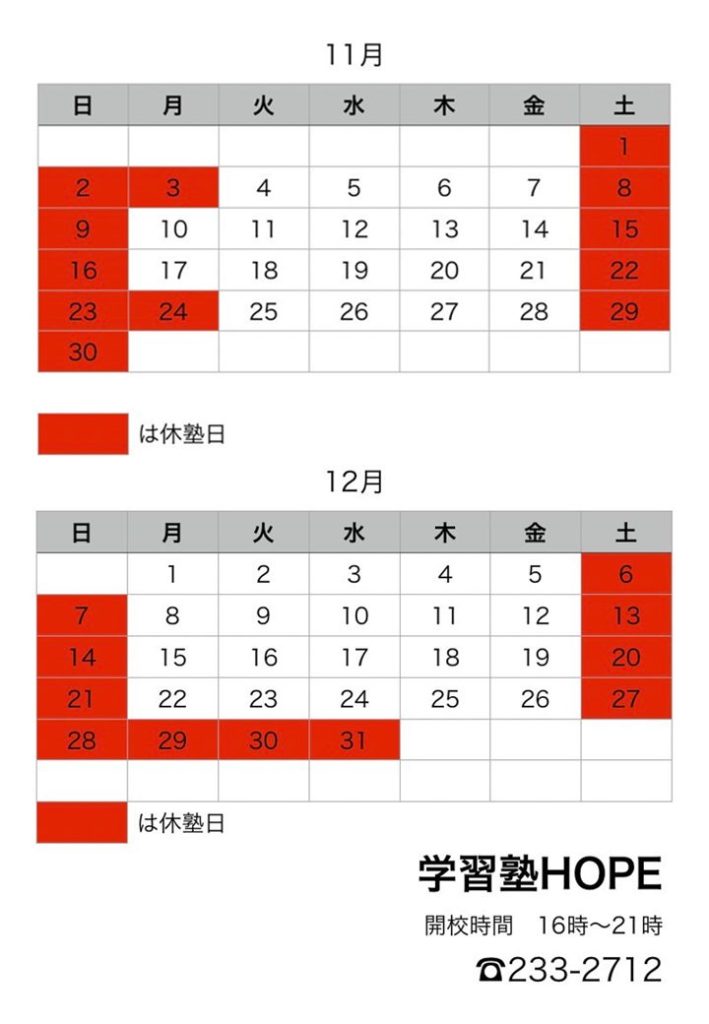 【学習塾HOPE】月間予定表を更新しました! 2025 11/13 お知らせ 2025年11月13日 こんにちは。学習塾HOPEです。 12月の月間予定表を更新しました!※合わせて11月の予定もご確認ください ご不明点などございましたら、お気軽にお問い合わせください! お知らせ よかったらシェアしてね! URLをコピーしました! 【学習塾HOPE】教室長コラム(11月) 【学習塾HOPE】テスト直前勉強会を実施しました! 関連記事 【学習塾HOPE】教室長コラム(1月) 2026年1月5日 【学習塾HOPE】月間予定表を更新しました! 2025年12月12日 【学習塾HOPE】小6対象 中学準備講座開講!! 2025年12月8日 【学習塾HOPE】教室長コラム(12月) 2025年12月3日 【学習塾HOPE】テスト直前勉強会を実施しました! 2025年11月17日 【学習塾HOPE】教室長コラム(11月) 2025年11月4日 【学習塾HOPE】月間予定表を更新しました! 2025年10月17日 【学習塾HOPE】教室長コラム(10月) 2025年10月1日