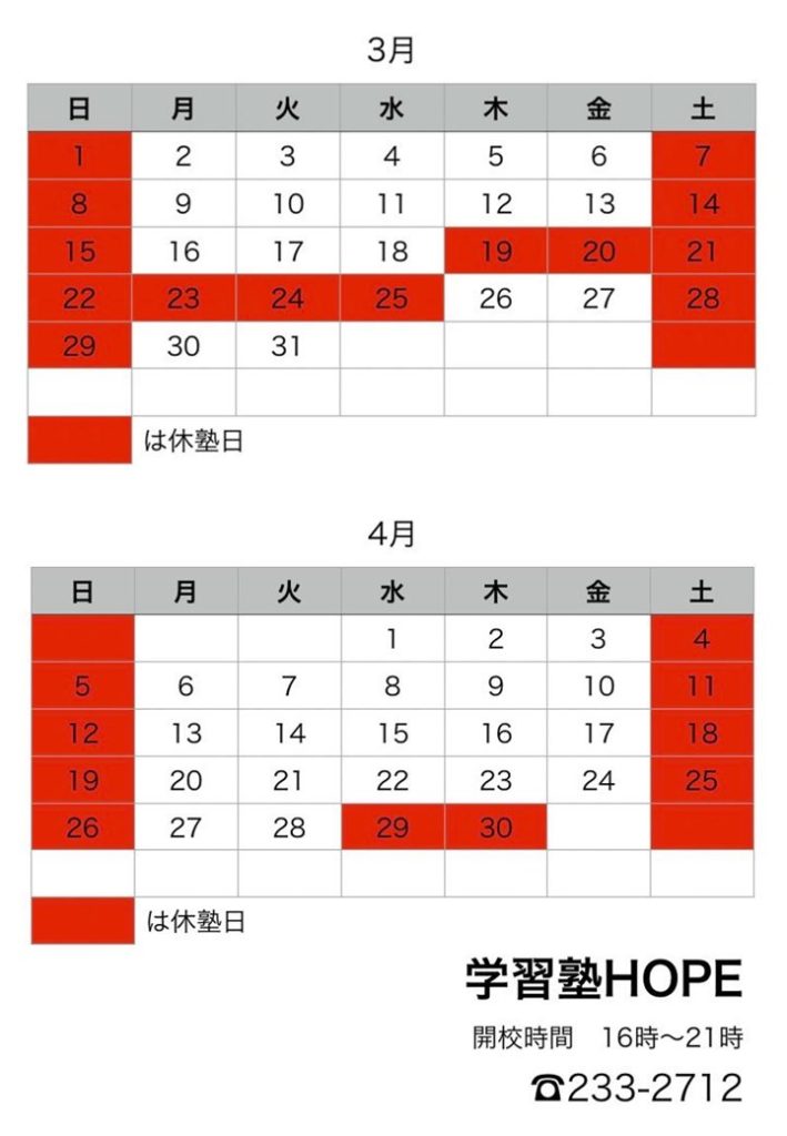 【学習塾HOPE】月間予定表を更新しました! 2026 3/13 お知らせ 2026年3月13日 こんにちは。学習塾HOPEです。 4月の月間予定表を更新しました!※合わせて3月の予定もご確認ください ご不明点などございましたら、お気軽にお問い合わせください! お知らせ よかったらシェアしてね! URLをコピーしました! 【学習塾HOPE】3月・4月は2週間無料でご体験いただけます! 関連記事 【学習塾HOPE】3月・4月は2週間無料でご体験いただけます! 2026年3月5日 【学習塾HOPE】教室長コラム(2月) 2026年3月3日 【学習塾HOPE】月間予定表を更新しました! 2026年2月17日 【学習塾HOPE】新中2・新中3生の募集を一旦停止します 2026年2月1日 【学習塾HOPE】教室長コラム(2月) 2026年2月1日 【学習塾HOPE】月間予定表を更新しました! 2026年1月9日 【学習塾HOPE】教室長コラム(1月) 2026年1月5日 【学習塾HOPE】月間予定表を更新しました! 2025年12月12日