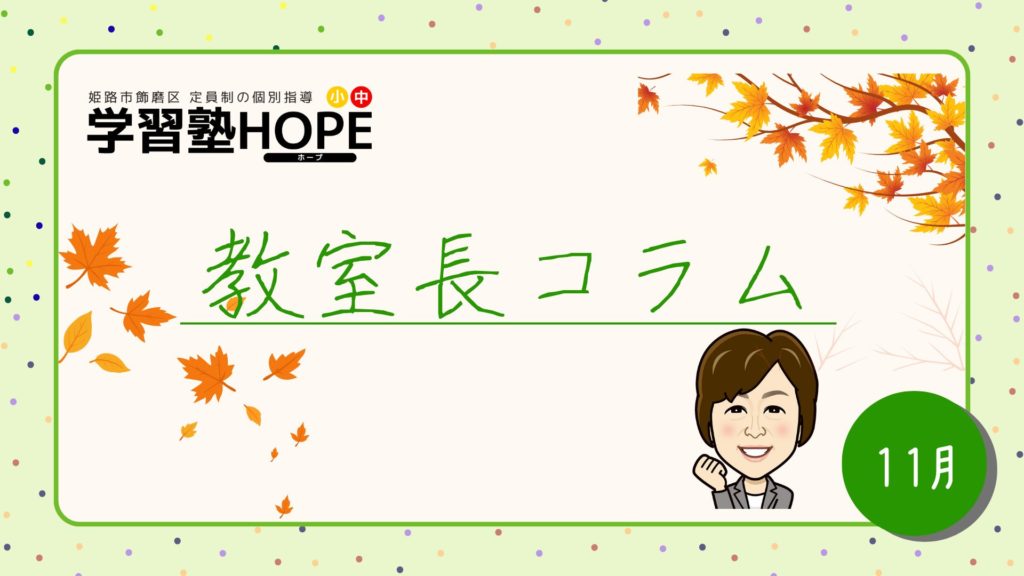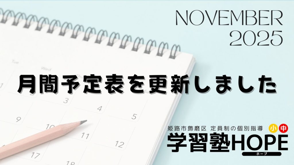 こんにちは。学習塾HOPEです。 11月の月間予定表を更新しました!※合わせて10月の予定もご確認ください ご不明点などございましたら、お気軽にお問い合わせください! -