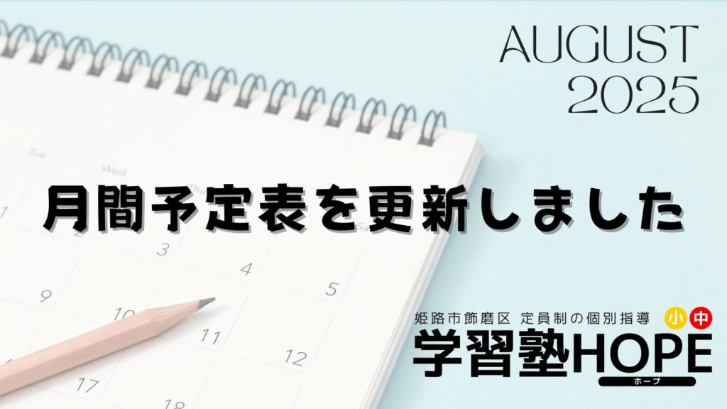 こんにちは。学習塾HOPEです。 8月の月間予定表を更新しました!※合わせて7月の予定もご確認ください ご不明点などございましたら、お気軽にお問い合わせください! -
