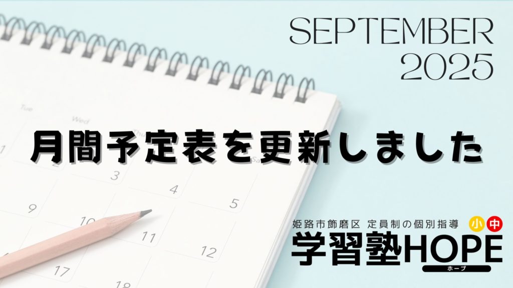 こんにちは。学習塾HOPEです。 9月の月間予定表を更新しました!※合わせて8月の予定もご確認ください ご不明点などございましたら、お気軽にお問い合わせください! -