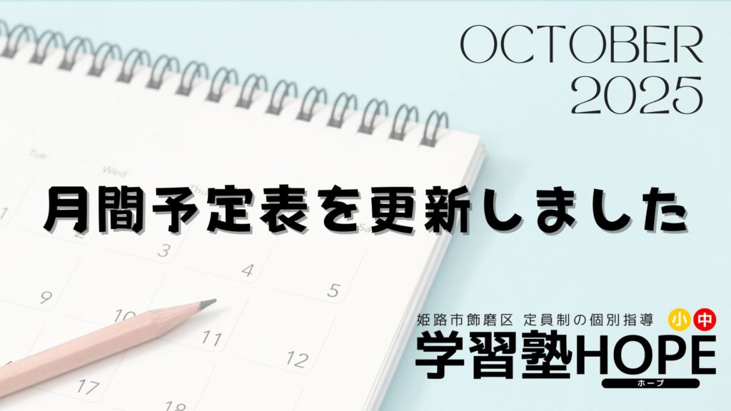 こんにちは。学習塾HOPEです。 10月の月間予定表を更新しました!※合わせて9月の予定もご確認ください ご不明点などございましたら、お気軽にお問い合わせください! -
