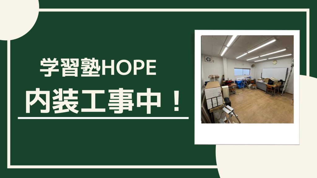 こんにちは!学習塾HOPEです。 2025年1月の新規開校に向けて、ただいま内装のリフォームを進めています!完成次第、皆さまにご報告いたしますので、楽しみにお待ちくださいね。 -