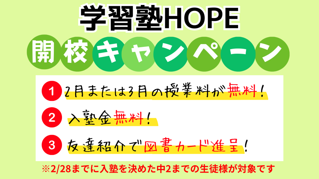 こんにちは。学習塾HOPEです! このたび新規開校を記念して『開校キャンペーン』を実施します! 最大で約30,000円がお得になるキャンペーンです!この機会にぜひご入塾をご検討ください! 開校キャンペーン その➊ 2月または3月の授業料が無料! 2月ま... -