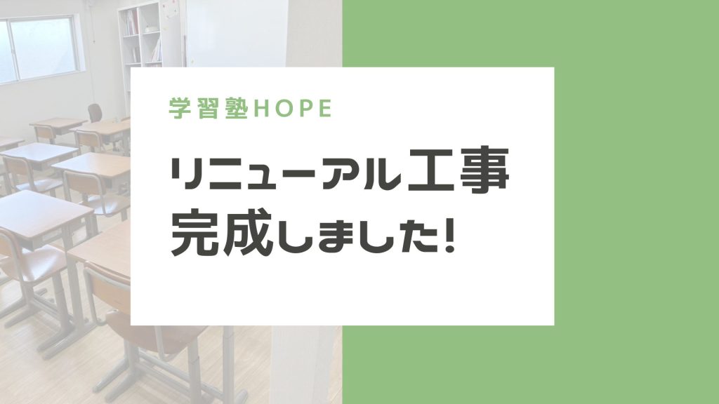 こんにちは。学習塾HOPEです。 ついにリニューアル工事が完成しました! 生徒の皆さんが快適に学べるよう、教室のデザインや設備を一新し、より充実した環境を整えました。 新しい教室で、皆さんの学びを全力でサポートしていきます!ぜひ見学や体験授業に... -